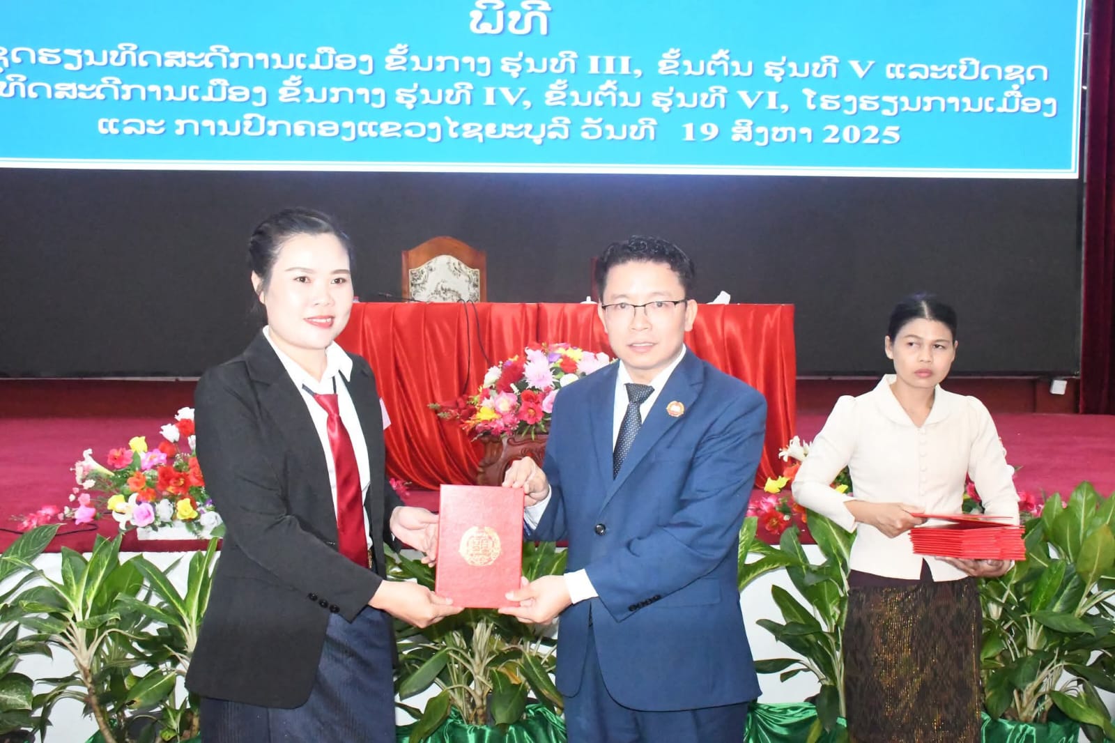 ພິທີປິດຊຸດຮຽນທິດສະດີການເມືອງຂັ້ນຕົ້ນ ຮຸ່ນທີ V ຂັ້ນກາງ ຮຸ່ນທີIII ແລະ ເປີດຊຸດຮຽນທິດສະດີການເມືອງຂັ້ນຕົ້ນ ຮຸ່ນທີ VI ຂັ້ນກາງ ຮຸ່ນທີ IV ໄດ້ຈັດຂຶ້ນໃນຕອນບ່າຍວັນທີ 19 ສິງຫາ 2025 ນີ້ ຢູ່ທີ່ຫໍປະຊຸມໃຫຍ່ຂອງແຂວງໄຊຍະບູລີ ເປັນກຽດເຂົ້າຮ່ວມຂອງທ່ານ ດວງຕາ ໄຊວຸດ ຮອງເລຂາພັກແຂວງ, ທ່ານ ປອ ດາວສະຫວັນ ເຄືອມີໄຊ  ຮອງເລຂາຄະນະບລິຫານງານພັກ ຮອງຫົວໜ້າສະຖາບັນການເມືອງ ແລະ ການປົກຄອງແຫ່ງຊາດ, ມີບັນດາແຂກທີ່ຖືກເຊີນ,ຄູ-ອາຈານ ພ້ອມດ້ວຍນັກສຶກສາຂັ້ນຕົ້ນ ແລະ ຂັ້ນກາງເຂົ້າຮ່ວມ.