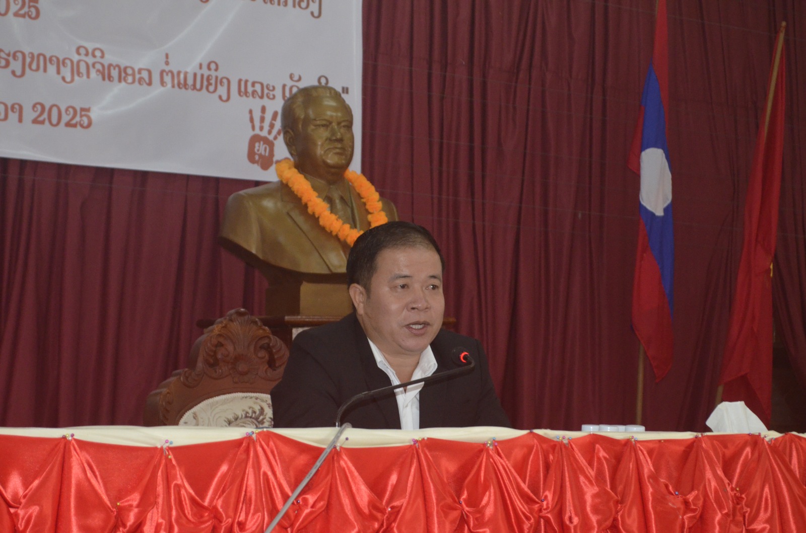 ໃນພິທີທ່ານ ສົມບູນ ຂຽວພະນາ ຮອງເລຂາຄະນະບໍລິຫານງານພັກເມືອງ ໄດ້ໃຫ້ກຽດຂື້ນປາຖະກະຖາວັນສາກົນຢຸດຕິການໃຊ້ຄວາມຮຸນແຮງຕໍ່ແມ່ຍິງ ແລະ ເດັກນ້ອຍ ເຊິ່ງທ່ານໃຫ້ຮູ້ວ່າ: ການໃຊ້ຄວາມຮຸນແຮງຕໍ່ແມ່ຍິງ ແລະ ເດັກນ້ອຍແມ່ນບັນຫາທີ່ເກີດຂື້ນມາດົນນານແລ້ວໃນທົ່ວໂລກ ແລະ ປະຈຸບັນ ກາຍເປັນປະກົດການຫຍໍ້ທໍ້ອັນໜຶ່ງໃນສັງຄົມ  ການໃຊ້ຄວາມຮຸນແຮງຕໍ່ແມ່ຍິງ ແລະ ເດັກນ້ອຍແມ່ນມີຫຼາຍ ສາເຫດຄື: ຍ້ອນຮີດຄອງປະເພນີ, ທຳນຽມປະຕິບັດ, ຄວາມເຊື່ອຖື, ຄວາມທຸກຍາກ, ທັດສະນະຂອງສັງຄົມຕໍ່ແມ່ຍິງ, ລະດັບການສຶກສາ ແລະ ອື່ນໆ. ຄວາມຮຸນແຮງທີ່ເກີດຂື້ນມັນໄດ້ສົ່ງຜົນກະທົບທາງດ້ານຮ່າງກາຍ, ຈິດໃຈ ແລະ ເປັນອຸປະສັກກີດຂວາງເຮັດໃຫ້ແມ່ຍິງບໍ່ໄດ້ເຂົ້າຮ່ວມໃນການພັດທະນາ ແລະ ຄວາມສະເໝີພາບລະຫວ່າງຍິງ – ຊາຍ. ນອກຈາກນີ້ຄວາມຮຸນແຮງຕໍ່ແມ່ຍິງ ແລະເດັກນ້ອຍ ຍັງສົ່ງຜົນກະທົບທາງລົບຕໍ່ການພັດທະນາເສດຖະກິດ – ສັງຄົມ ສະນັ້ນ, ພັກ – ລັດຖະບານ ຍາມໃດກໍໃຫ້ຄວາມສຳຄັນຕໍ່ກັບບັນຫາດັ່ງກ່າວ ໂດຍໄດ້ເອົາໃຈໃສ່ໃນການສົ່ງເສີມຄວາມສະເໝີພາບ ແລະ ຄວາມເທົ່າທຽມກັນລະຫວ່າງຍິງ – ຊາຍທາງດ້ານການເມືອງ, ເສດຖະກິດ, ວັດທະນະທຳສັງຄົມ ແລະ ຄອບຄົວ, ລົບລ້າງທຸກຮູບການໃນການຈຳແນກແມ່ຍິງ, ເອົາໃຈໃສ່ໃນການປົກປ້ອງຊ່ວຍເຫຼືອເດັກ  ແລະ ສ້າງມາດຕະການເພື່ອໃຫ້ການສະໜັບສະໜູນ ແລະ ຊ່ວຍເຫຼືອແມ່ຍິງຜູ້ຖືກເຄາະຮ້າຍຈາກການໃຊ້ຄວາມຮຸນແຮງທັງຢູ່ພາຍໃນ ແລະ ຕ່າງປະເທດ ເຊິ່ງໄດ້ສະແດງອອກໃນບັນດານິຕິກຳ ແລະ ນະໂຍບາຍທີ່ໄດ້ຮັບຮອງແລ້ວຄື: ກົດຫມາຍວ່າດ້ວຍການຕ້ານ ແລະ ສະກັດກັ້ນການໃຊ້ຄວາມຮຸນແຮງຕໍ່ແມ່ຍິງ ແລະ ເດັກ, ແຜນດຳເນີນງານແຫ່ງຊາດກ່ຽວກັບການປ້ອງກັນ ແລະ ລຶບລ້າງຄວາມຮຸນແຮງຕໍ່ແມ່ຍິງ ແລະ ເດັກນ້ອຍ ແລະ ທ່ານ ຍັງໄດ້ຜ່ານສານ ຂອງພະນະທ່ານ ສອນໄຊ ສີພັນດອນ ນາຍົກລັດຖະມົນຕີ ແຫ່ງ ສປປລາວ ເນື່ອງໃນໂອກາດ ລະນຶກວັນສາກົນເພື່ອລຶບລ້າງຄວາມຮຸນແຮງຕໍ່ແມ່ຍິງ ພາຍໄຕ້ຫົວຂໍ້ທີ່ວ່າ: ຮ່ວມແຮງຮ່ວມໃຈ ເພື່ອຍຸດຕິການໃຊ້ຄວາມຮຸນແຮງ ຜ່ານທາງດິຈິຕອນ ຕໍ່ແມ່ຍິງ ແລະ ເດັກຍິງທຸກຄົນ ຕື່ມອິກ.