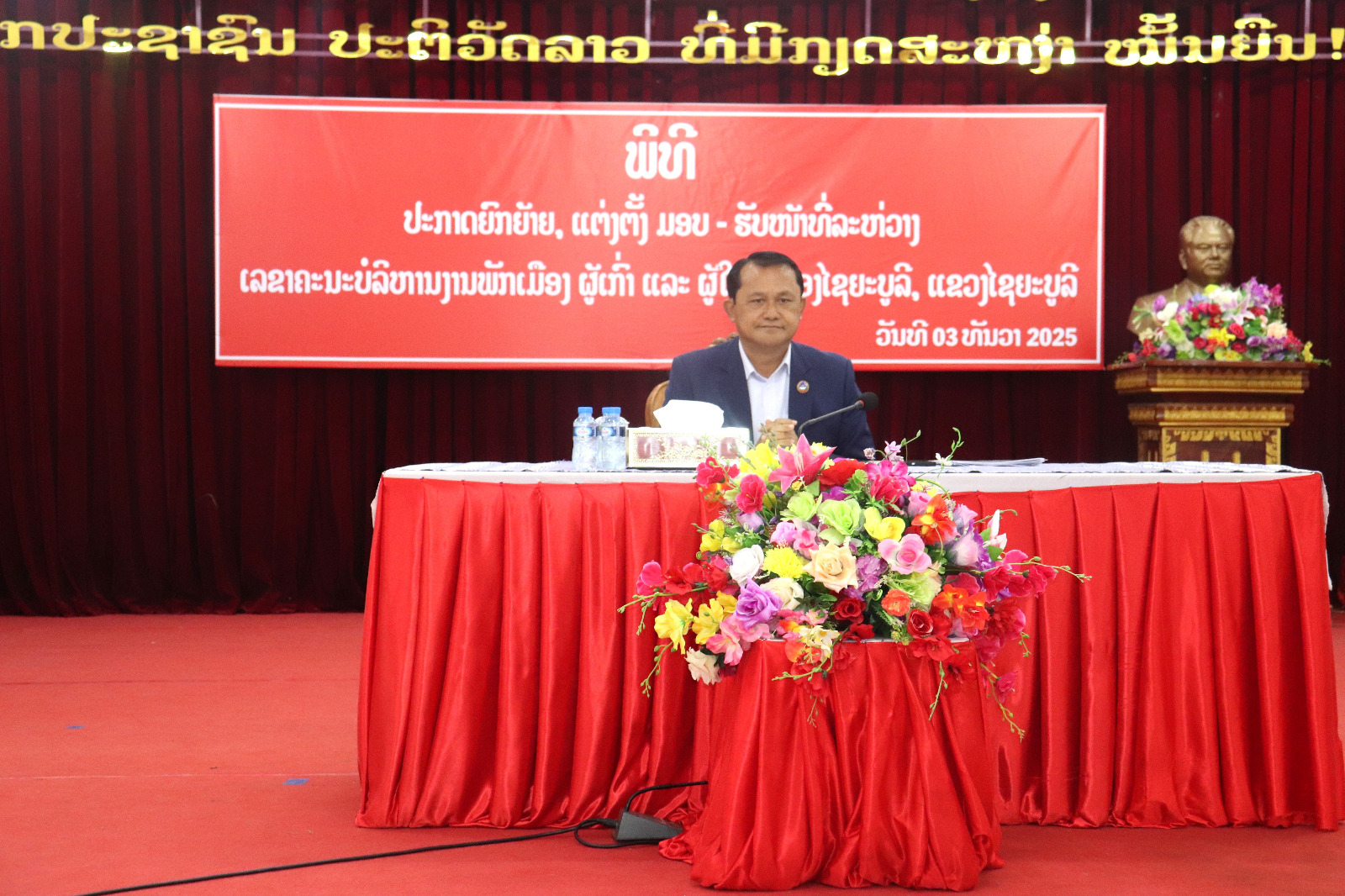 ໃນຕອນເຊົ້າວັນທີ 3 ທັນວາ 2025 ນີ້ ເມືອງ ໄຊຍະບູລີ ໄດ້ຈັດພິທີປະກາດຍົກຍ້າຍ, ແຕ່ງຕັ້ງມອບຮັບໜ້າທີ່ລະຫວ່າງເລຂາຄະນະບໍລິຫານງານພັກເມືອງຜູ້ເກົ່າ ແລະ ຜູ້ໃໝ່ຂື້ນ ທີ່ຫ້ອງປະຊຸມຫ້ອງວ່າການເມືອງໄຊຍະບູລີ ໂດຍການເປັນປະທານຂອງສະຫາຍ ເພັງນິລັນ ຄຳພັນເພັງ ເລຂາຄະນະບໍລິຫານງານພັກແຂວງ ປະທານສະພາປະຊາຊົນແຂວງ; ມີກຳມະການປະຈຳພັກແຂວງ, ກຳມະການພັກແຂວງ, ຄະນະປະຈຳພັກເມືອງ, ກຳມະການພັກເມືອງ, ຫົວໜ້າ, ຮອງຫົວໜ້າຫ້ອງການ, ອົງການ, ກົມກອງ, ຫົວໜ້າ, ຮອງຫົວໜ້າໜ່ວຍງານ ແລະ ເລຂາໜ່ວຍພັກບ້ານເທດສະບານເມືອງເຂົ້າຮ່ວມ.