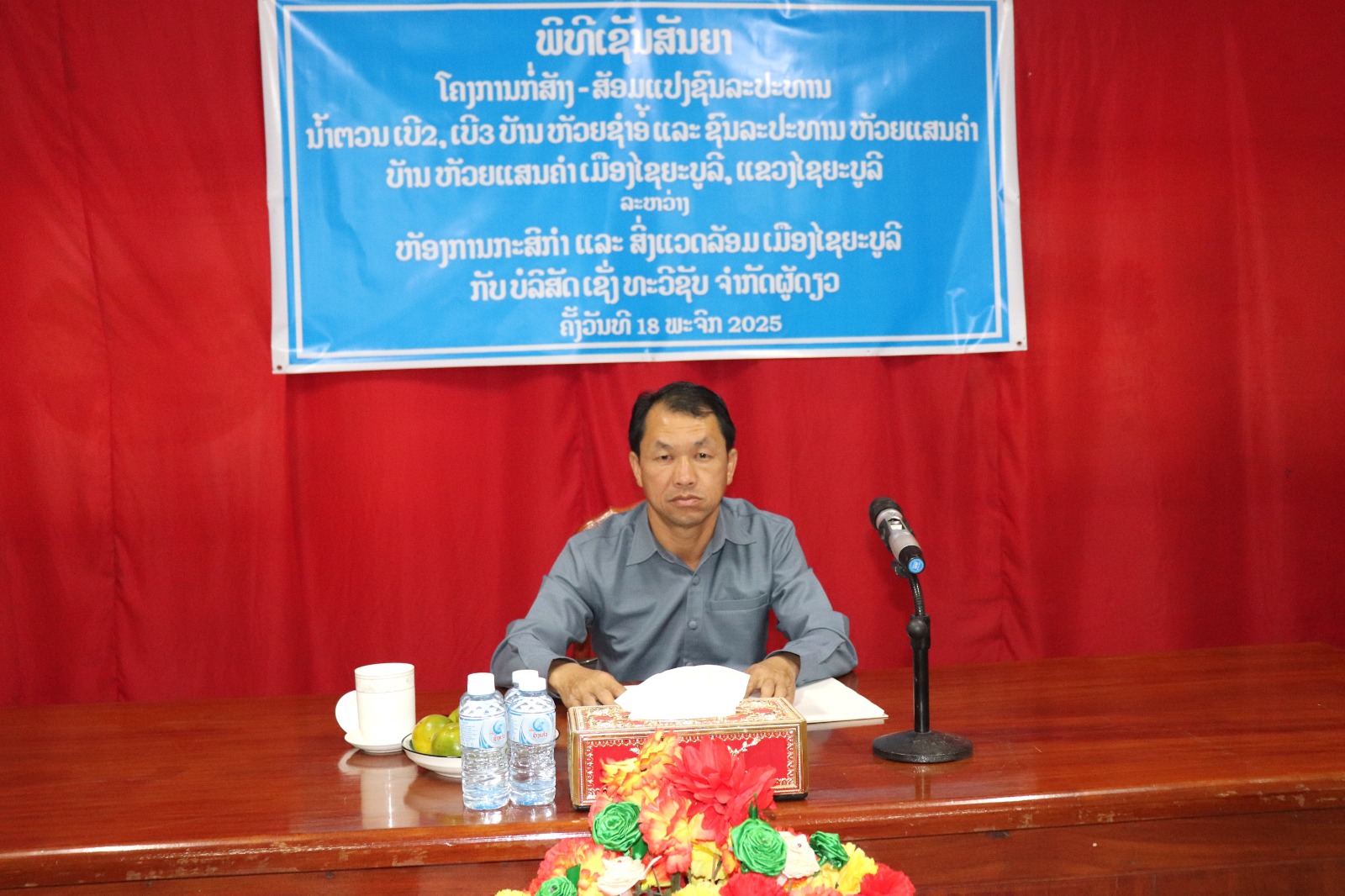 ໃນພິທີທ່ານ ສີຈັນ ຫານເສີກ ກຳມະການພັກເມືອງ ຫົວໜ້າຫ້ອງການກະສິກຳ ແລະ ສິ່ງແວດລ້ອມເມືອງໄດ້ຂື້ນຜ່ານຮ່າງສັນຍາຮັບເໝົາໂຄງການກໍ່ສ້າງສ້ອມແປງຫົວງານ ແລະ ຄອງເໝືອງຫ້ວຍແສນຄຳ; ບ້ານ ຫ້ວຍແສນຄຳ ບາງຕອນທ່ານກ່າວວ່າ: ສັນຍາສະບັບນີ້ສ້າງຂຶ້ນເພື່ອແນໃສ່ການກໍ່ສ້າງ-ສ້ອມແປງຫົວງານ ແລະ ລະບົບຄອງເໜືອງໂຄງການຊົນລະປະທານ ຫ້ວຍແສນຄໍາ ໃຫ້ສາມາດນໍາໃຊ້ໄດ້ເປັນປົກກະຕິ ແລະ ຮັບປະກັນໃນການສະໜອງນໍ້າໃຫ້ແກ່ການຜະລິດໄດ້ຕາມຄາດໝາຍທັງສອງລະດູຄື: ລະດູແລ້ງ ແລະ ລະດູຝົນ ແລະ ຮັບປະກັນການກໍ່ສ້າງໄດ້ຕາມແບບ, ມາດຖານ,ເຕັກນິກ ແລະ ສຳເລັດຕາມກຳນົດເວລາ; ໂຄງການກໍ່ສ້າງ – ສ້ອມແປງຫົວງານ ແລະ ລະບົບຄອງເໝືອງ; ໂຄງການຊົນລະປະທານ ຫ້ວຍແສນຄໍາຕັ້ງຢູ່ຫ່າງຈາກຕົວເມືອງໄຊຍະບູລີ ໄປທາງທິດໃຕ້ກິໂລແມັດທີ 14 ເສັ້ນທາງເລກ 4, ແຍກເຂົ້າໄປທາງເບື້ອງຊ້າຍຫາກຸ່ມບ້ານນໍ້າຕວນ ປະມານ 21 km ຂຶ້ນກັບຂອບເຂດດິນຄຸ້ມຄອງຂອງ ບ້ານ ຫ້ວຍແສນຄໍາ; ມີມູນຄ່າການກໍ່ສ້າງລວມອາກອນທັງໝົດ 1ຕື້816 ລ້ານກວ່າກີບ, ກຳນົດເວລາຂອງສັນຍາແມ່ນ 5 ເດືອນ ເຊິ່ງເລີ່ມແຕ່ວັນທີ 18 ພະຈິກ 2025 ຫາ ວັນທີ 18 ເມສາ 2026; ການຊໍາລະການກໍ່ສ້າງຝ່າຍ ກ” ແລະ ” ຝ່າຍ ຂ ໄດ້ເອກະພາບກັນໂດຍຊຳລະຕາມງົບປະມານອະນຸມັດເງິນກອງທຶນພັດທະນາຊຸມຊົນໂຄງການໄຟຟ້າພະລັງງານຄວາມຮ້ອນຫົງສາ; ສຳລັບໂຄງການກໍ່ສ້າງສ້ອມແປງຫົວງານ ແລະ ຄອງເໝືອງນ້ຳຕວນເບີ2, ເບີ3 ແມ່ນມີມູນຄ່າການກໍ່ສ້າງທັງໝົດ 1 ຕື້ 835 ລ້ານກວ່າກີບ, ກຳນົດການກໍ່ສ້າງແມ່ນ 5 ເດືອນເຊິ່ງເລີ່ມແຕ່ວັນທີ 18 ພະຈິກ 2025 ຫາ ວັນທີ 18 ເມສາ 2026; ການຊໍາລະການກໍ່ສ້າງຝ່າຍ ກ” ແລະ ” ຝ່າຍ ຂ ໄດ້ເອກະພາບກັນໂດຍຊຳລະຕາມງົບປະມານອະນຸມັດເງິນກອງທຶນພັດທະນາຊຸມຊົນໂຄງການໄຟຟ້າພະລັງງານຄວາມຮ້ອນຫົງສາ; ຈາກນັ້ນໃນພິທີກໍ່ໄດ້ຈັດພິເຊັນສັນຍາລະຫວ່າງທ່ານ ສີຈັນ ຫານເສີກ ກຳມະການພັກເມືອງ ຫົວໜ້າຫ້ອງການກະສິກຳ ແລະ ສິ່ງແວດລ້ອມເມືອງ( ຝ່າຍກ) ເຈົ້າຂອງໂຄງການ ແລະ ທ່ານ ບຸນທັນ ອ່ອນສີ ຕາງໜ້າບໍລິສັດ ເຊັ່ງທະວີຊັບ ຈຳກັດຜູ້ດຽວ( ຝ່າຍຂໍ)ຜູ້ຮັບເໝົາກໍ່ສ້າງ ໂດຍມີທ່ານ ສົມຈິດ ຮັງເຊັງຊົວ ຄະນະປະຈຳພັກເມືອງ ຮອງປະທານຄະນະກຳມະການປົກຄອງເມືອງ ແລະ ພາກສ່ວນທີ່ກ່ຽວຂ້ອງເຂົ້າຮ່ວມເປັນສັກຂີພະຍານ.